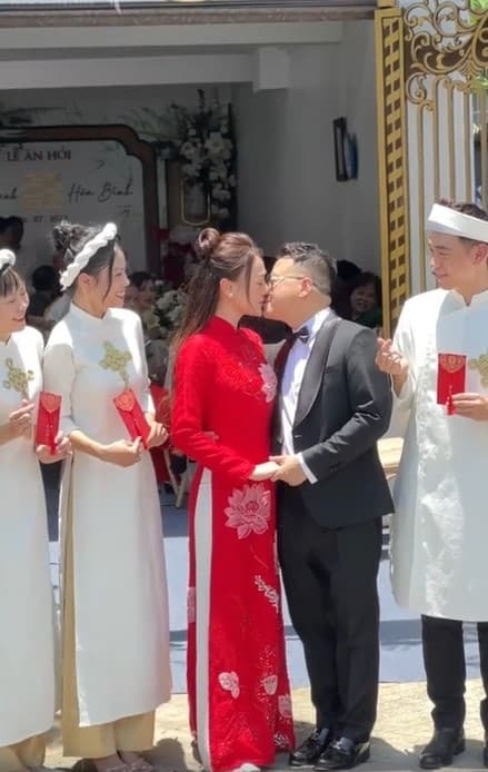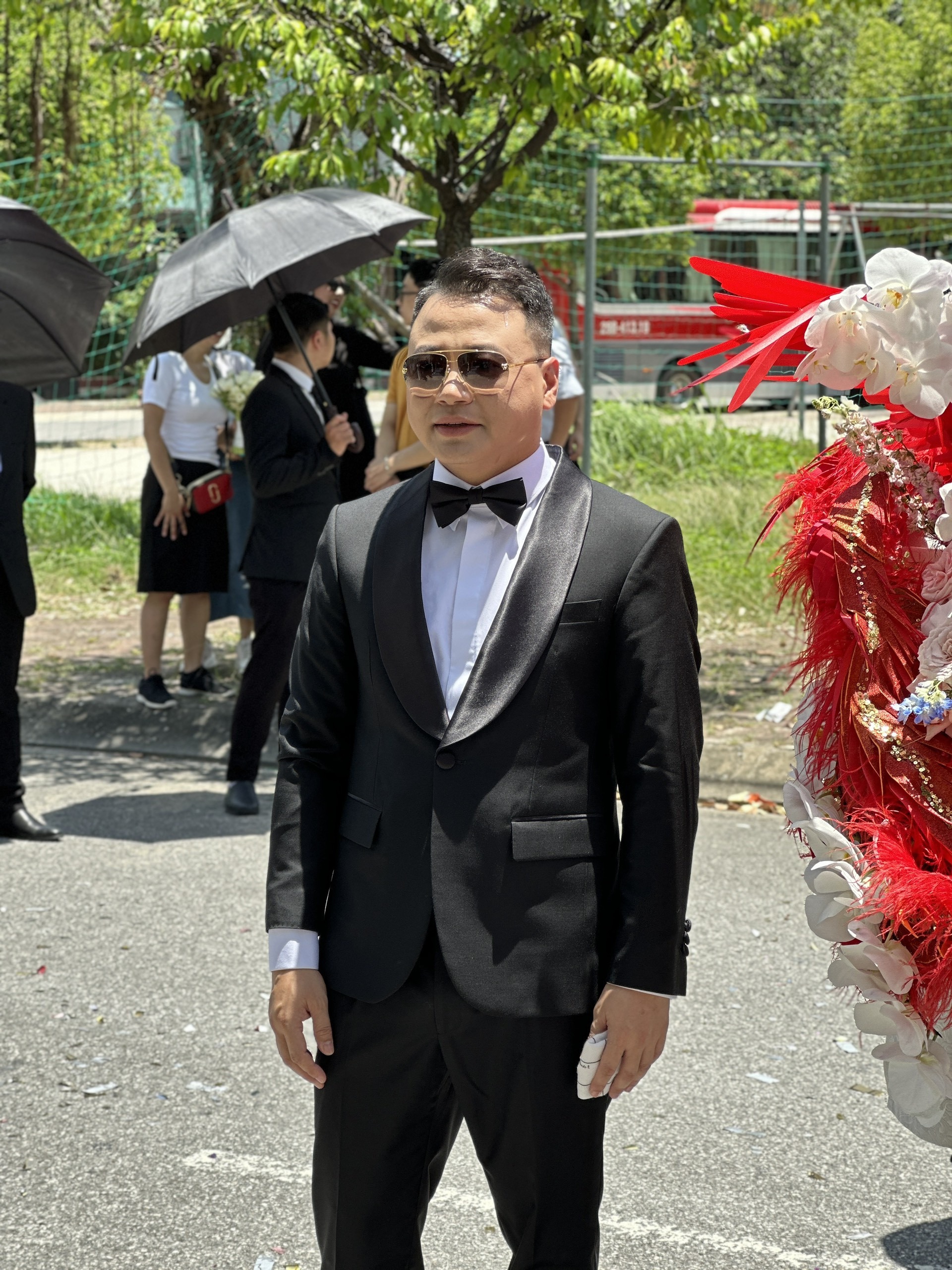Trong ngày đặc biệt này, diễn viên Hương vị tình thân diện áo dài màu đỏ có hoạ tiết hoa sen do Hoa hậu Ngọc Hân thiết kế riêng. Về phía Shark Bình, nam doanh nhân cũng mặc vest bảnh bao, đi xế sang Maybach đến đón vợ.