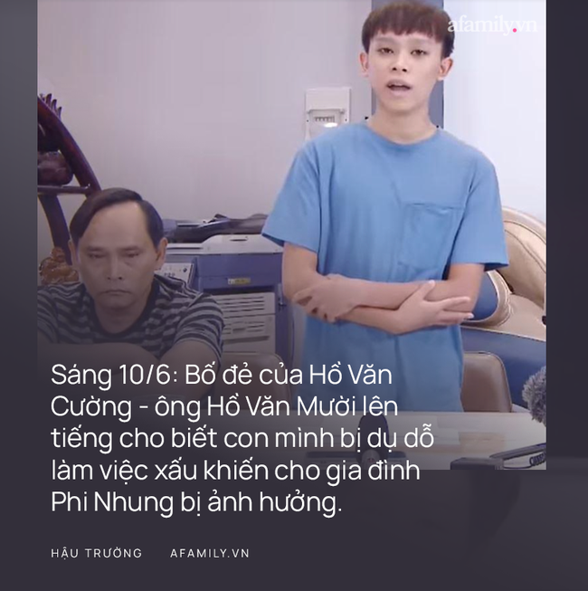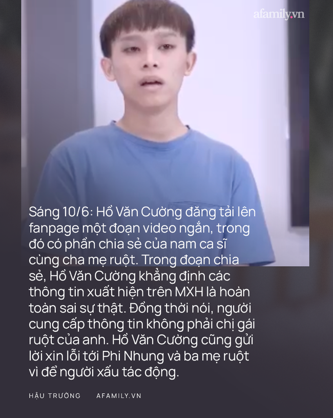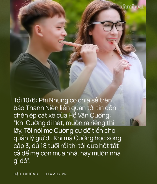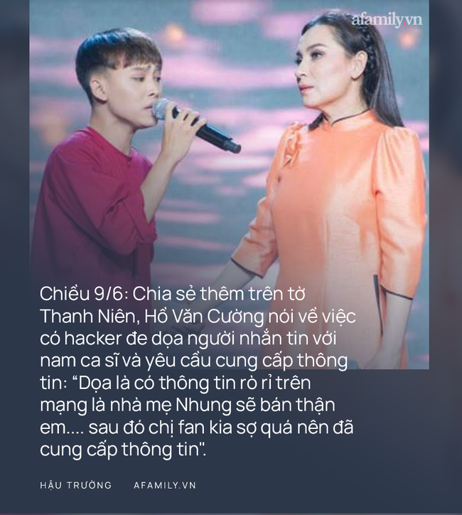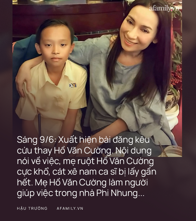 Vụ việc được mở màn vào sáng 9/6, sau khi trên mạng xuất hiện bài đăng kêu cứu thay Hồ Văn Cường. Nội dung xoay quanh việc, mẹ ruột Hồ Văn Cường phải sống cực khổ khi làm giúp việc trong nhà Phi Nhung. Về phần Hồ Văn Cường, toàn bộ tiền cát xê mà nam ca sĩ đi hát đều bị lấy đi gần hết... Người đăng tải bài viết cũng công khai đoạn tin nhắn được cho là của Hồ Văn Cường với một người khác làm bằng chứng.
