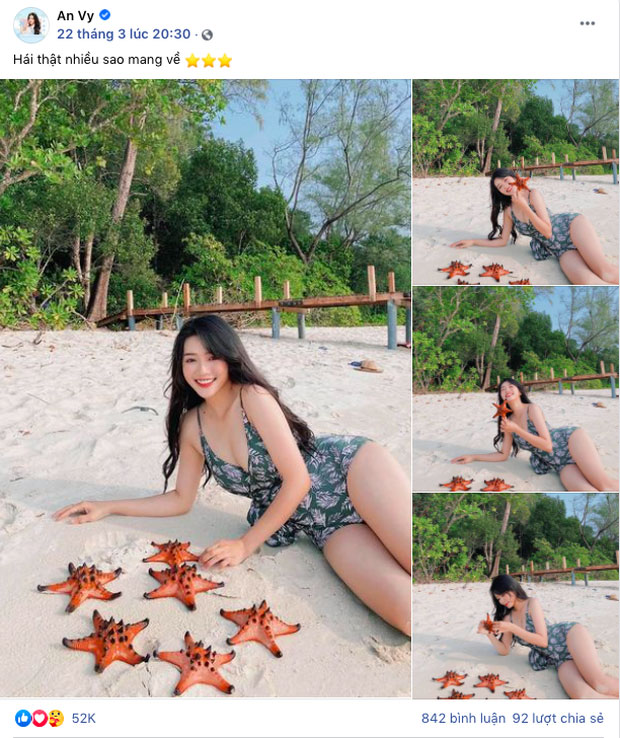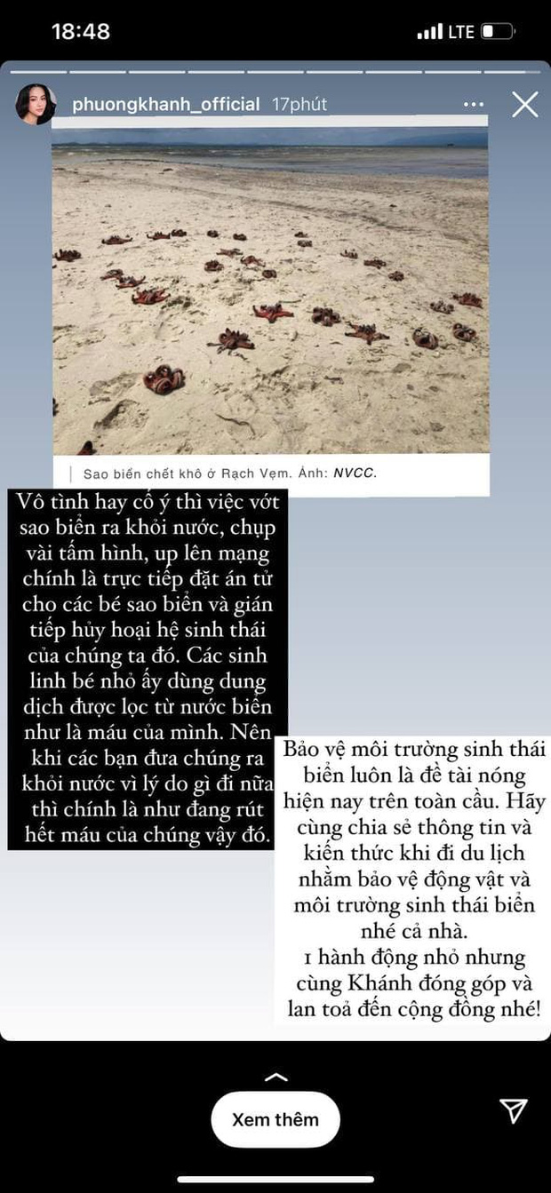 "Vô tình hay cố ý thì việc vớt sao biển ra khỏi nước, chụp vài tấm hình, up lên mạng chính là trực tiếp đặt án tử cho các bé sao biển và gián tiếp huỷ hoại hệ sinh thái của chúng ta đó. Các sinh linh bé nhỏ ấy dùng dung dịch được lọc từ nước biển như là máu của mình. Nên khi các bạn đưa chúng ra khỏi nước vì lý do gì đi nữa thì chính là như đang rút hết máu của chúng vậy đó. Bảo vệ môi trường sinh thái biển luôn là đề tài nóng hiện nay trên toàn cầu. Hãy cùng chia sẻ thông tin và kiến thức khi đi du lịch nhằm bảo vệ động vật và môi trường sinh thái biển nhé cả nhà. Một hành động nhỏ nhưng cùng Khánh đóng góp và lan tỏa đến cộng đồng nhé!", Phương Khánh viết.