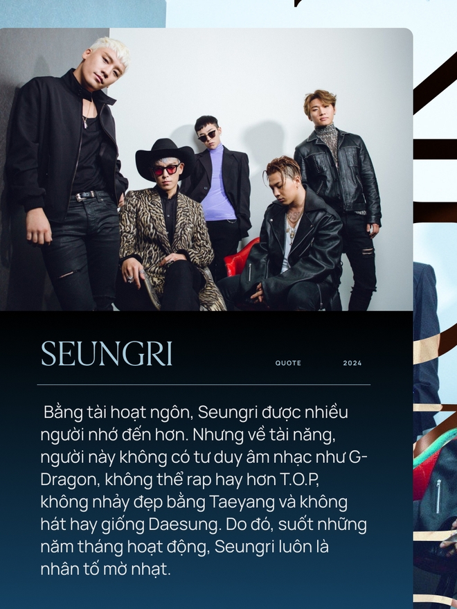 Bản thân Seungri cũng từng thừa nhận việc mình luôn đứng sau các anh. “Tôi luôn làm nền trong BIGBANG, không có gì thực sự tạo nên dấu ấn của riêng tôi. T.O.P đại diện về hình ảnh, Taeyang nhảy tốt. Về âm nhạc hay thời trang, mọi người luôn nhắc đến G-Dragon. Vì vậy tôi nghĩ mình phải làm hết sức trên các chương trình tạp kỹ, nhưng rồi Daesung xuất hiện. Không có vị trí nào dành cho tôi. Tôi không có lựa chọn nào ngoài làm việc khác để sống sót.”