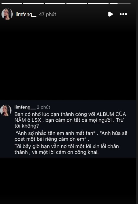 “Bạn còn nhớ lúc bạn thành công với album của năm ở LXS (Làn sóng xanh) bạn cảm ơn tất cả mọi người trừ tôi không? ‘Anh sợ anh nhắc tên em anh mất fan’, ‘anh hứa sẽ post một bài riêng cảm ơn em’.