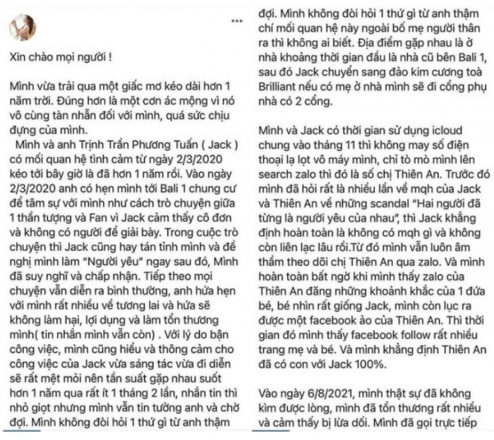 Trong bài “bóc phốt” diễn viên Thiên An cho biết, cả hai đã chia tay chỉ 20 ngày sau khi cô sinh con vì “không tìm được tiếng nói chung”. Sau đó Thiên An một mình nuôi con mà không nhận được bất cứ sự hỗ trợ tinh thần từ phía Jack. Nữ diễn viên cũng tiết lộ, Jack chỉ chu cấp 5 triệu đồng mỗi tháng cho con và không hề có hành động chăm sóc bé từ lúc sinh ra đến hiện tại.