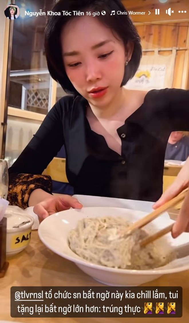 Tối 12/5, trên trang cá nhân, Tóc Tiên gây chú ý khi chia sẻ kỷ niệm bất ổn trong ngày sinh nhật của mình. Để đón tuổi mới, Tóc Tiên và Touliver đã dắt tay nhau lên Đà Lạt, tận hưởng không gian riêng tư. Theo giọng ca Ngày Mai, ông xã đã tổ chức một buổi tiệc lãng mạn nhân dịp sinh nhật cô. Tuy nhiên, cái kết cho buổi tiệc này chính là vợ chồng Tóc Tiên bị trúng thực.