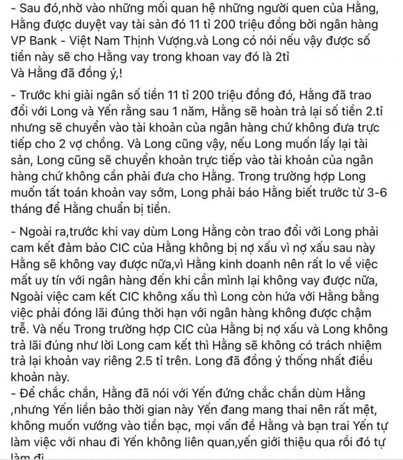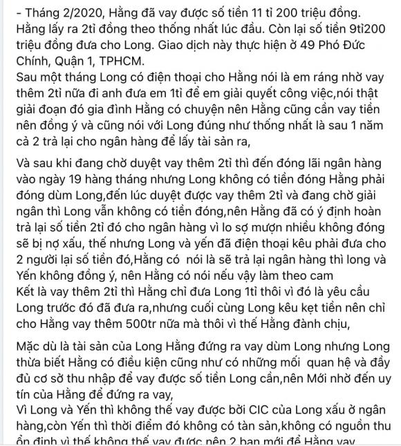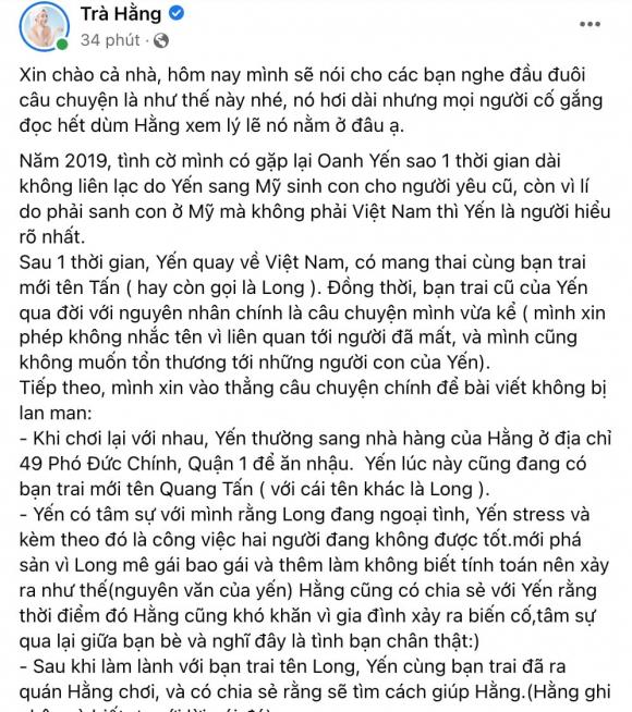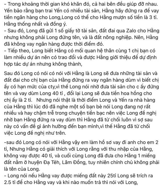 Cho đến cách đây ít giờ, Trà Ngọc Hằng đã chính thức lên tiếng về câu chuyện ân oán tình thù giữa mình và Oanh Yến bằng dòng trạng thái siêu dài. Bà mẹ 1 con cho biết, chính Oanh Yến và bạn trai tên Long đã nhờ cô hỗ trợ vay tiền ngân hàng với tài sản thế chấp là đất đai đã chuyển nhượng quyền sử dụng sang cho nữ ca sĩ để dễ làm giấy tờ.