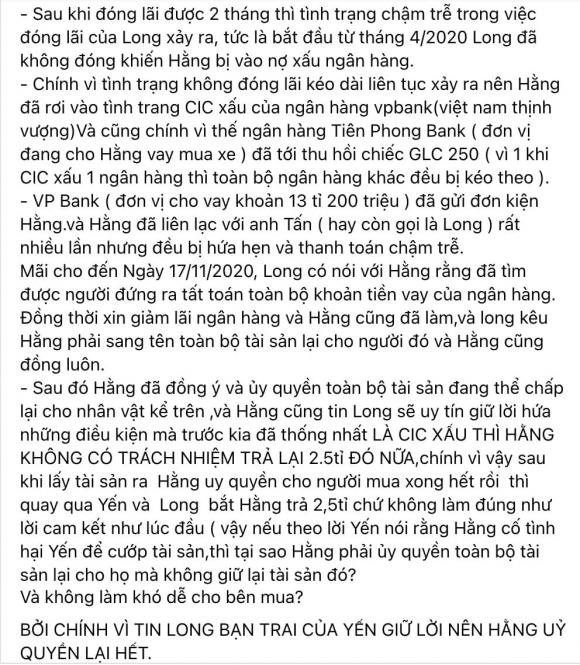 Nể tình bạn bè, Trà Ngọc Hằng đã hết lòng giúp đỡ nhưng trong quá trình trả góp ngân hàng, Oanh Yến và bạn trai đã chậm trễ khiến cô bị ngân hàng liệt vào diện nợ xấu.