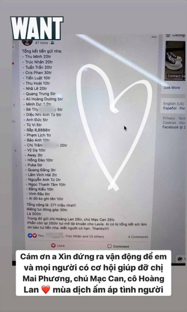 Tổng số tiền mà Trấn Thành kêu gọi được là 300 triệu đồng, dự định sẽ chia làm 2: 250 triệu mở sổ tiết kiệm cho bé Lavie, 50 triệu còn lại dành để giúp đỡ 2 nghệ sĩ là Mạc Can và Hoàng Lan trang trải cuộc sống cũng như trị bệnh. Hành động thiết thực và ý nghĩa của các nghệ sĩ đã nhận được rất nhiều lời khen ngợi từ khán giả.