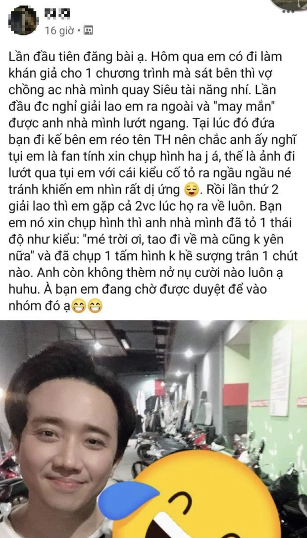 Tối 4/5, Trấn Thành vừa bất ngờ bị một khán giả đăng bài tố mắc bệnh ngôi sao. Cụ thể, người này chia sẻ bức hình chụp chung với nam MC và viết: "Hôm qua em có đi làm khán giả cho một chương trình mà sát bên là vợ chồng anh chị nhà mình. Lần đầu được nghỉ giải lao, em ra ngoài và may mắn được anh nhà mình lướt ngang. Tại lúc đó đứa bạn đi kế bên em réo tên anh Thành nên chắc anh ấy nghĩ tụi em là fan tính xin chụp hình, thế là ảnh đi lướt qua tụi em với cái kiểu cố tỏ ra ngầu ngầu né tránh khiến em nhìn rất dị ứng. Rồi lần thứ 2 giải lao thì em gặp cả 2 vợ chồng lúc ra về luôn. Bạn em nó xin chụp hình thì anh nhà mình đã tỏ thái độ như kiểu: 'Trời ơi, đi về mà cũng không yên nữa' và đã chụp 1 tấm hình không hề sượng trân 1 chút nào. Anh còn không thèm nở nụ cười nào luôn ạ".
