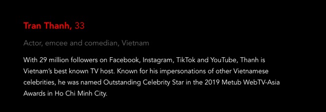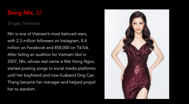 Ở phần giới thiệu của Đông Nhi, tạp chí này cũng nhấn mạnh về việc cô là một trong những ngôi sao được yêu thích nhất tại Việt Nam với 2,3 triệu người theo dõi trên Instagram, 8,4 triệu trên Facebook và 858.000 trên TikTok.