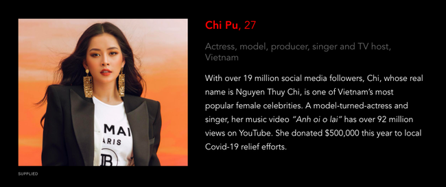 Trong phần giới thiệu ngắn về Chi Pu, Forbes chia sẻ: "Với hơn 19 triệu người theo dõi trên mạng xã hội, Chi Pu (tên thật là Nguyễn Thùy Chi) là một trong những nữ ca sĩ nổi tiếng nhất Việt Nam. Là một người mẫu kiêm ca sĩ, MV "Anh ơi ở lại" của Chi Pu đã có hơn 92 triệu lượt xem trên YouTube. Cô đã quyên góp 500.000 USD trong năm nay cho các nỗ lực cứu trợ Covid-19 tại địa phương".