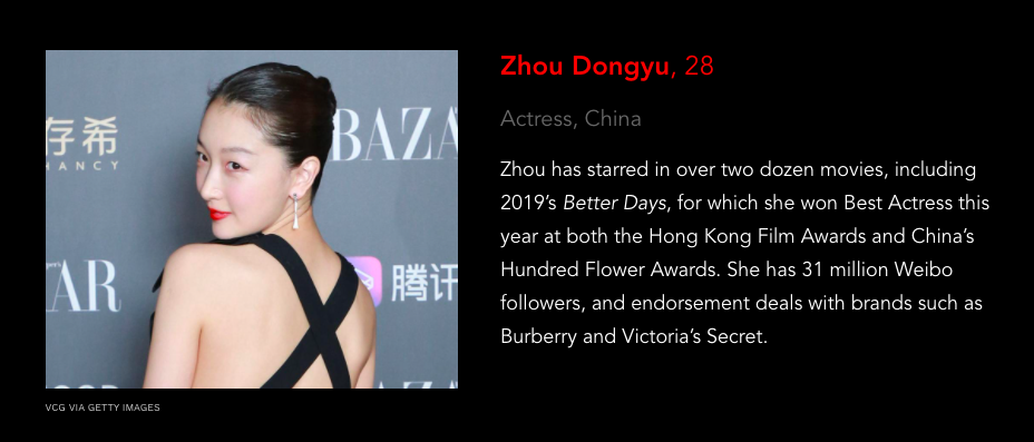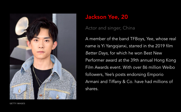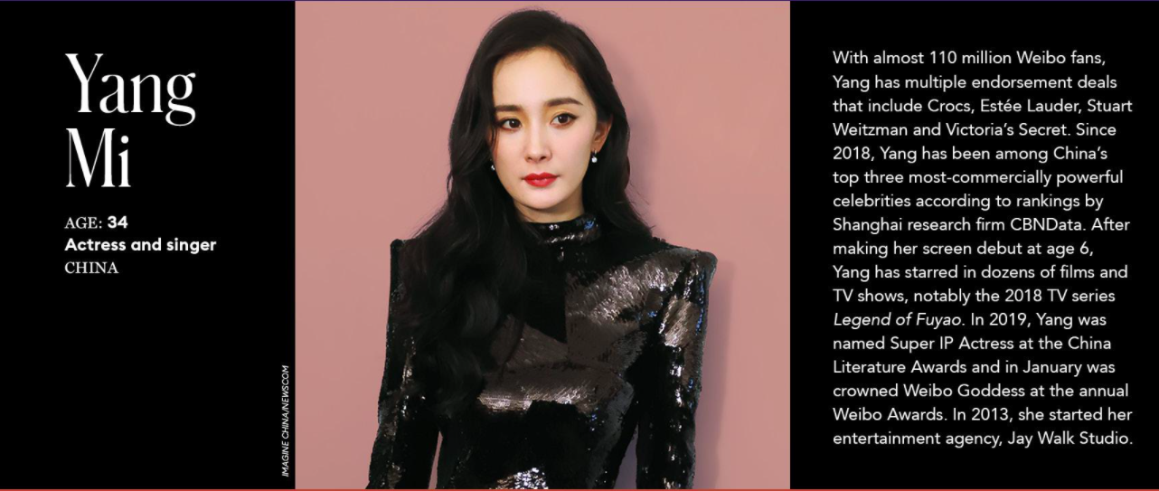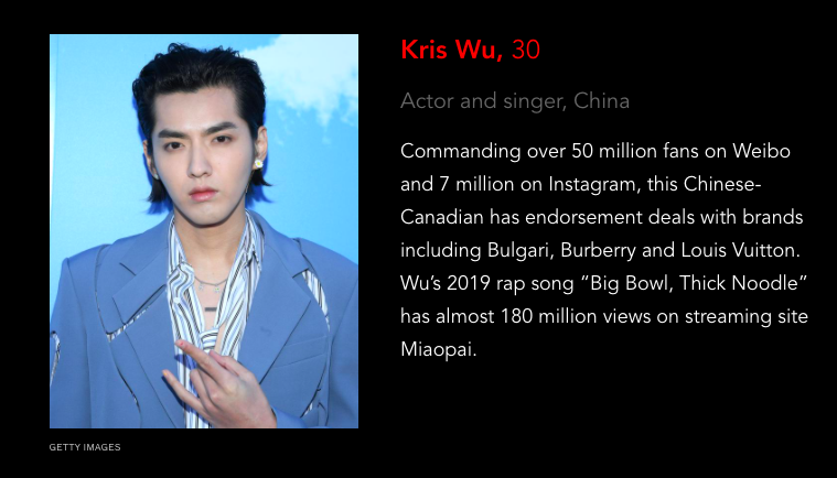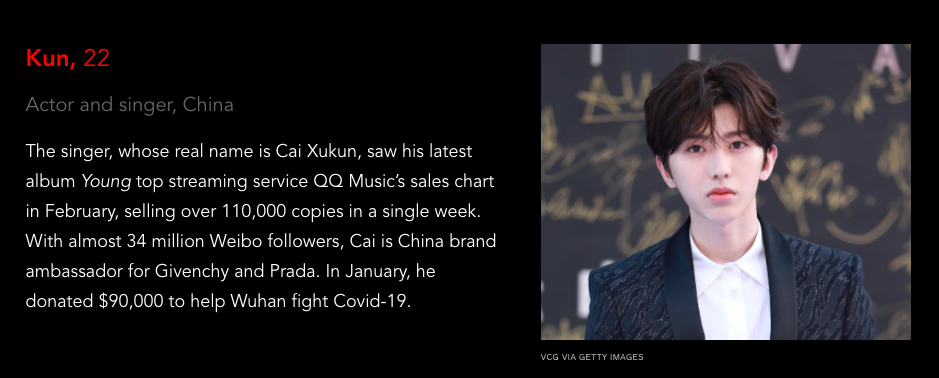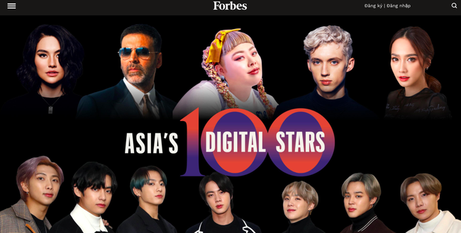 Tờ FORBES cũng cho biết, danh sách này bao gồm 100 ca sĩ, ban nhạc, ngôi sao điện ảnh và truyền hình từ khắp khu vực Châu Á - Thái Bình Dương, những người đã làm nên cơn bão truyền thông trên mạng xã hội.