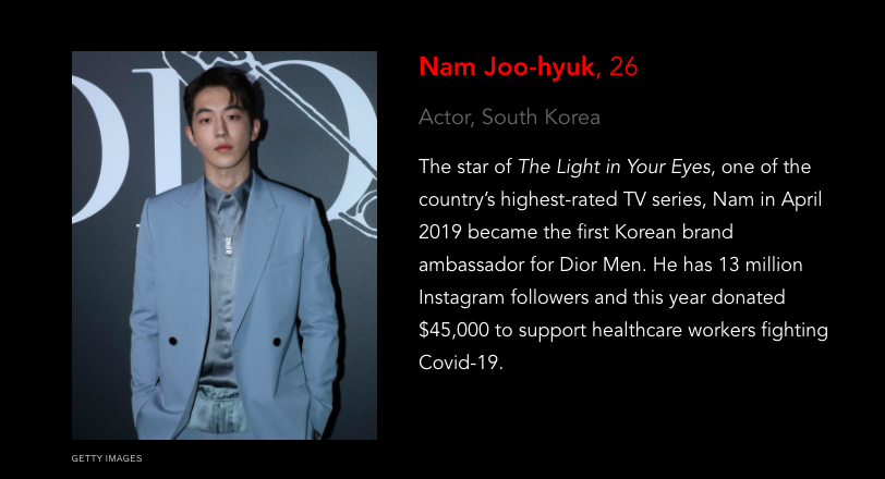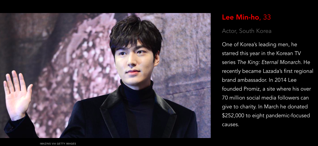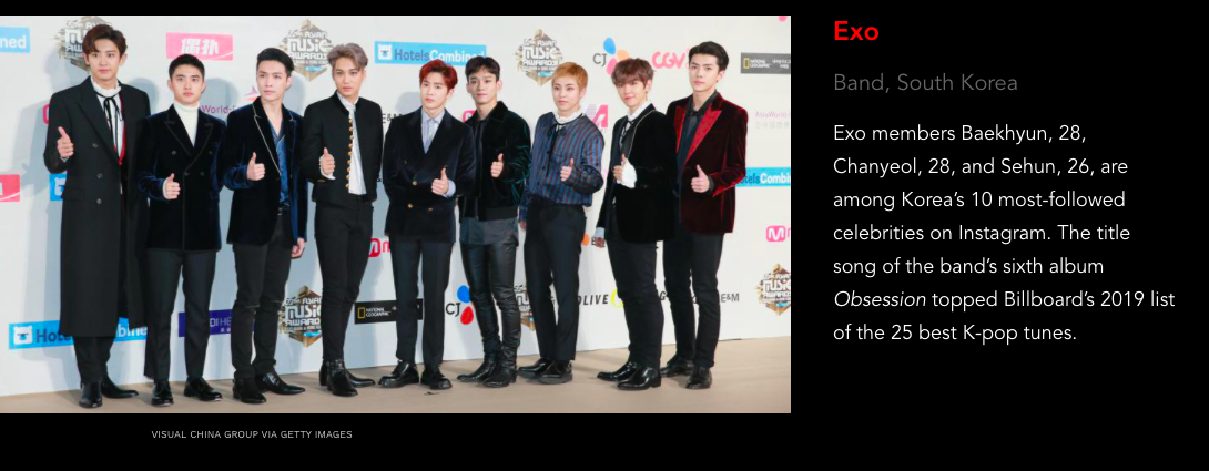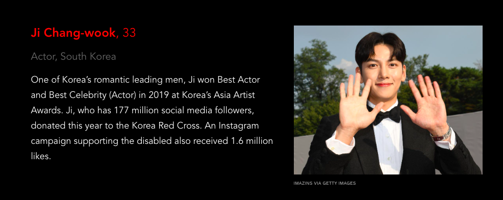 Ở Hàn Quốc, có những đại diện như BTS, BLACKPINK, TWICE, Lee Min Ho, IU, Ji Chang Wook, EXO... cũng được xếp trong danh sách của FORBES.