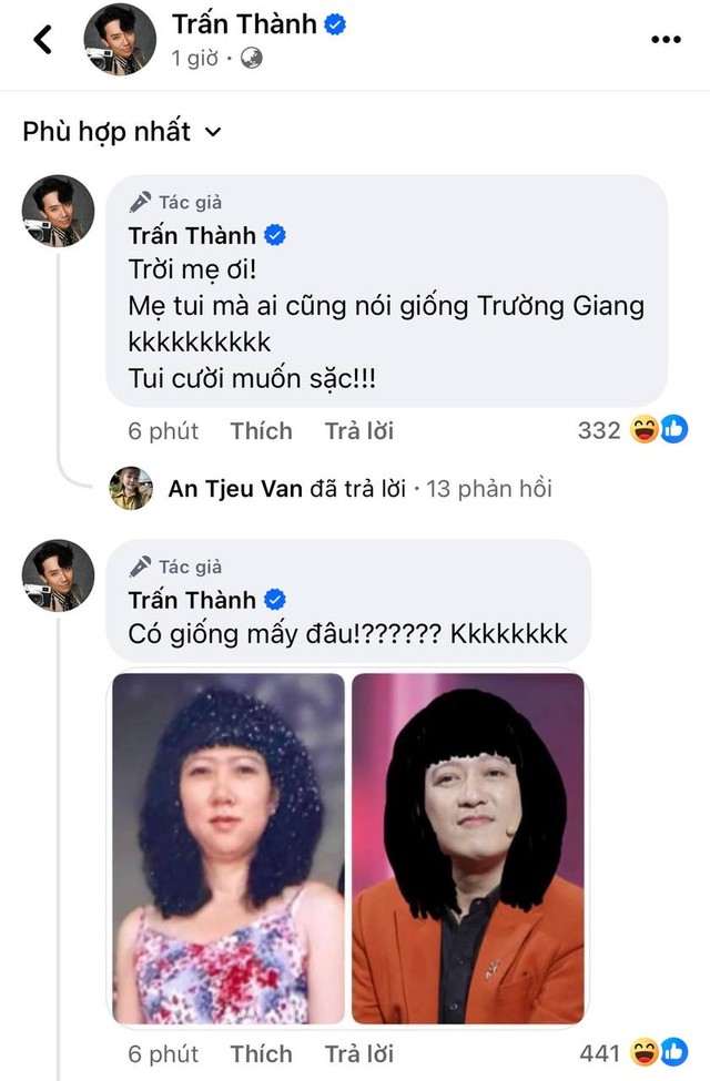 Chính ông xã của Hari Won cũng phải kêu trời, bật cười khoái chí khi phát hiện ra điều "độc lạ" hài hước này. Trấn Thành chia sẻ: "Trời mẹ ơi, mẹ tôi mà ai cũng nói giống Trường Giang. Tôi cười muốn sặc". Nam MC còn hào hứng chọn một bức ảnh của Trường Giang sau đó thêm mái tóc "pha ke" giống hệt của mẹ mình vào để so sánh rồi chốt hạ: "Có giống mấy đâu?". Trong khi liên tục dính tin đồn "bằng mặt không bằng lòng", Trấn Thành chứng minh vẫn rất thoải mái, vui vẻ khi nhắc đến người đồng nghiệp thân thiết.