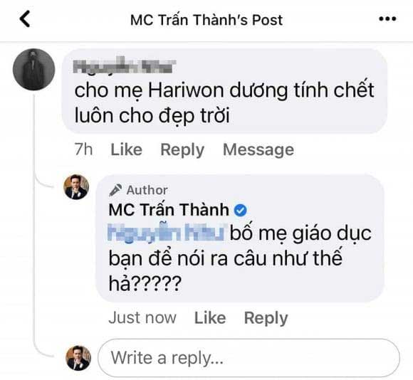 Hôm 23/1, vợ chồng Trấn Thành - Hari Won đau buồn khi chú mèo cưng không may bị rơi từ ban công tầng 32 xuống đất và chết một cách đau đớn. Giữa cảnh đau lòng này lại có một anti-fan để lại bình luận nguyền rủa Hari Won rằng: "Cho mẹ Hari Won dương tính chết luôn đi cho đẹp trời". Ngay lập tức, Trấn Thành thay bà xã đáp trả người này: "Bố mẹ giáo dục bạn để bạn nói như thế hả". Nam MC cũng công khai trang facebook của người này và viết: "Tôi không hiểu sao có những con người có thể thốt ra được câu nói này trong 1 hoàn cảnh như thế này. Mà là phụ nữ nữa chứ!".