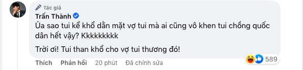 Chia sẻ của Trấn Thành khiến các fan không khỏi bật cười khen ngợi anh là "ông chồng quốc dân" đi làm vất vả để có tiền lo cho bà xã cuộc sống đầy đủ. Tuy nhiên, một cư dân mạng bất ngờ bình luận khiếm nhã: "Để thằng khác dắt chị Hari đi chơi và xài tiền anh kiếm ra dùm, anh chịu hông anh Thành?".