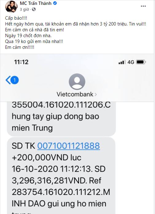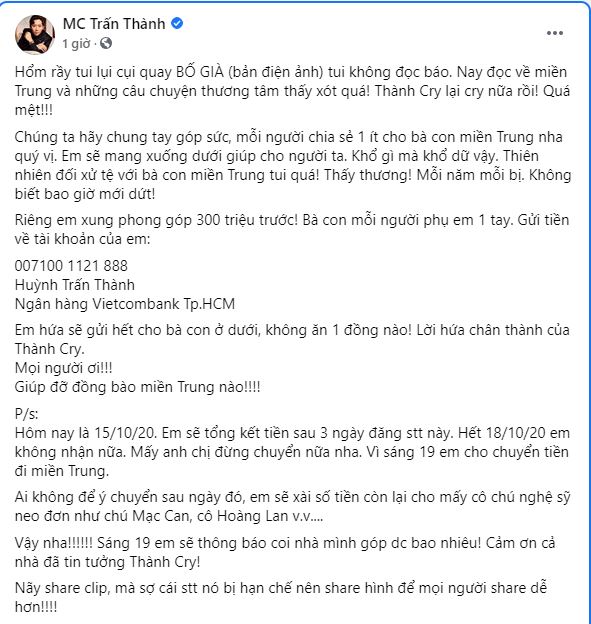 Ngày hôm qua, 15/10, Trấn Thành tiếp tục góp mặt vào danh sách các nghệ sĩ Việt đứng ra vận động người dân ủng hộ miền Trung. Anh xung phong góp quỹ 300 triệu đồng và cho biết mình sẽ nhận quyên góp trong vòng 3 ngày tới, từ 15 đến 18/10. Đến sáng 19/10, anh sẽ tổng hợp tất cả số tiền nhận được và gửi toàn bộ ra miền Trung.