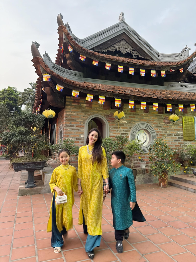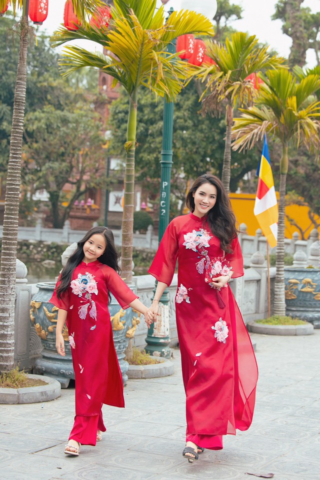 Cả gia đình siêu mẫu Trang Nhung cùng diện áo dài đồng điệu, họa tiết hoa, hòa vào dòng người du xuân. Trang Nhung cho biết thích không khí lạnh của mùa đông khi Tết đến, nhìn ngắm hoa đảo nở, cả nhà quây quần đón Tết cổ truyền.