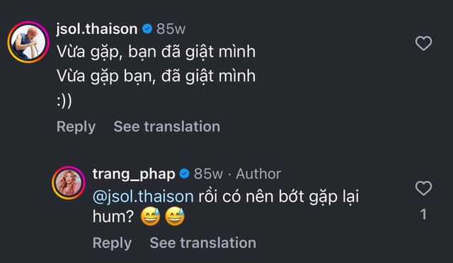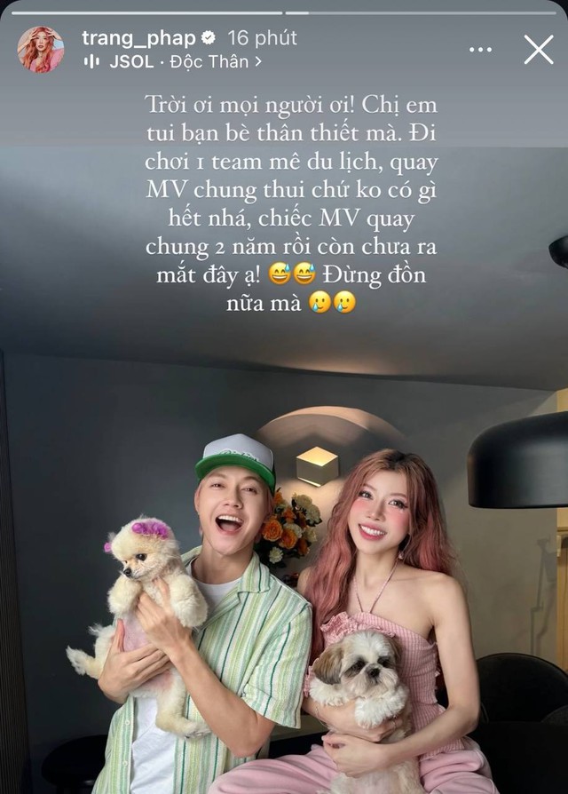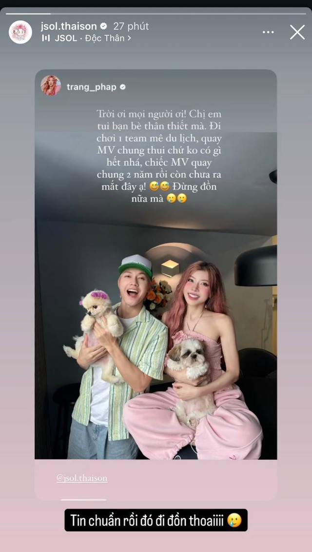 Sau khi Trang Pháp lên tiếng đính chính, JSOL cũng chia sẻ lại story của cô và khẳng định: "Tin chuẩn rồi đó đi đồn thôi". Kèm theo đó, nam ca sĩ sinh năm 1997 gắn bài hát có tên Độc thân như làm rõ tình trạng hiện tại của mình.