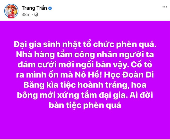 Cụ thể, trên trang facebook cá nhân của mình, Trang Trần viết: "Đại gia sinh nhật tổ chức phèn quá. Nhà hàng tầm công nhân người ta đám cưới mới ngồi bàn vậy. Cố tỏ ra mình ổn mà Nô Hề. Học Đoàn Di Băng kìa, tiệc hoành tráng, hoa bông mới xứng tầm đại gia. Ai đời bàn tiệc phèn quá".