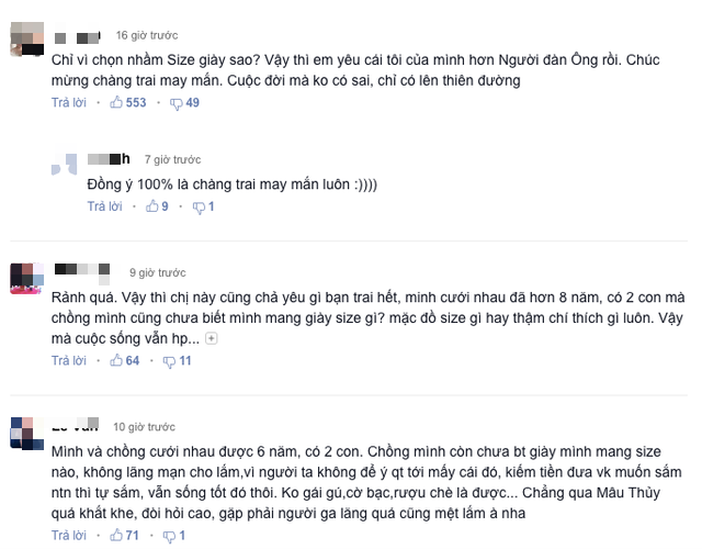 "Chỉ vì chọn nhầm size giày sao? Vậy thì em yêu cái Tôi của mình hơn Người đàn ông của mình rồi. Chúc mừng chàng trai may mắn. Cuộc đời mà không có sai, chỉ có lên thiên đường"; - Một chàng trai bình luận.