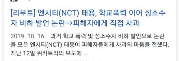 Trước đây, mỹ nam nổi tiếng nhất nhì Kpop Taeyong (NCT) từng thông qua SM Entertainment để chính thức xin lỗi, thừa nhận quá khứ gây sốc: nói bậy, chế giễu người thừa cân, xúc phạm người Nhật Bản, và đặc biệt là scandal lừa đảo khi bán hàng qua mạng. Scandal này bị "đào" lại không ít lần trong đợt quảng bá của NCT, khiến Taeyong lao đao. Đến nay, vụ việc này lại khiến công chúng dậy sóng vì nạn nhân của nam idol năm xưa được cho là đi đến bước đường cùng khi bị fan của Taeyong "khủng bố", nhục mạ.