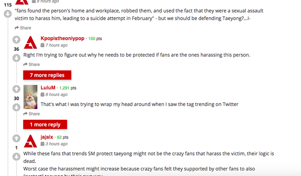 Cụ thể, vào ngày 29/4, một bài đăng trên trang mạng xã hội Pann trở thành chủ đề viral vì bóc trần thái độ của bộ phận fan quá khích của NCT. Theo đó, sau khi Taeyong xin lỗi, bộ phận fan này của NCT đã đe doạ, nạt nộ nạn nhân (gọi tắt là A), tố người này nói dối. Theo bệnh án ghi lại, A được cho là đã định tự sát sau khi chuyện này xảy ra.