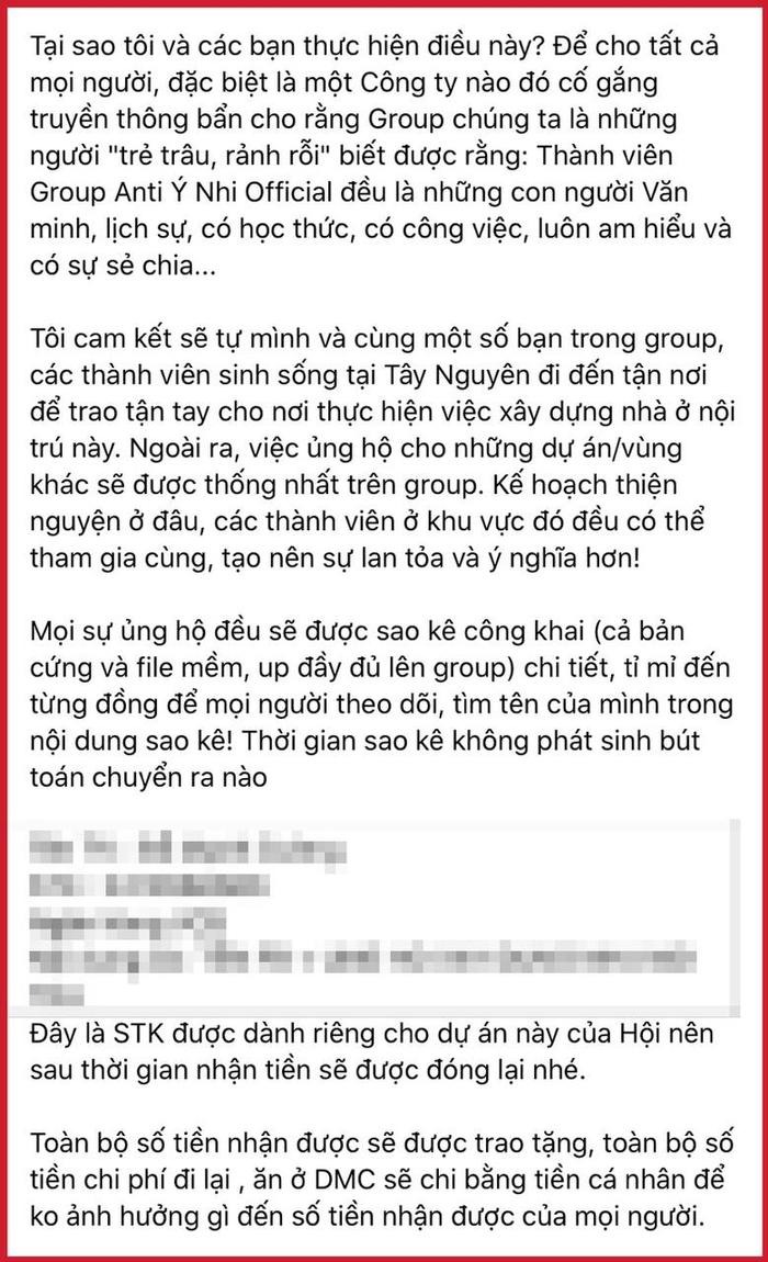 Mở đầu nội dung kêu gọi từ thiện, NTK Đỗ Mạnh Cường nhắc đến những phát ngôn "vạ miệng" của Hoa hậu Ý Nhi. Bên cạnh đó, anh còn có đoạn văn bản được cho là "dằn mặt" bên thứ ba. Cụ thể, Đỗ Mạnh Cường viết: "Tại sao tôi và các bạn thực hiện điều này? Để cho tất cả mọi người, đặc biệt là một công ty nào đó cố gắng nói hội nhóm chúng ta là những người "rảnh rỗi" biết được rằng: Thành viên trong group Anti Ý Nhi đều là những con người văn minh, lịch sự, có học thức, có công việc, luôn am hiểu và có sự sẻ chia".