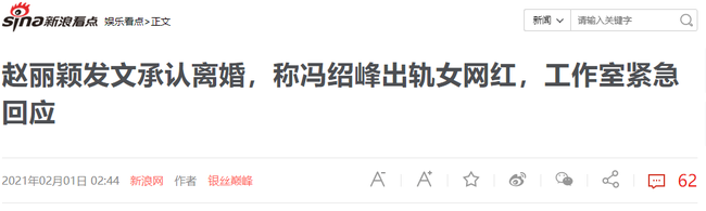 02/02/2021 22:07Triệu Lệ Dĩnh thừa nhận ly hôn Phùng Thiệu Phong, nguyên nhân đến từ nữ diễn viên trẻ này?