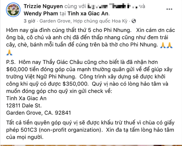 Trước đó, trong lễ tưởng nhớ cố ca sĩ Phi Nhung, quản lý của cô là Diễm Phạm đã đại diện những người thân thiết gửi 50 nghìn đô (tương đương 1,13 tỷ đồng) vào quỹ từ thiện. Wendy Phạm cho biết đã nhận 1,6 tỷ đồng trong tang lễ của mẹ, 500 triệu đồng do khách viếng ở tịnh xá gửi vào. Vào 49 ngày của Phi Nhung, con gái cô sẽ trao cho tịnh xá Giác An một nửa số tiền trên, nửa còn lại sẽ tìm cách gửi về các tổ chức giúp đỡ người mắc Covid-19 ở Việt Nam.