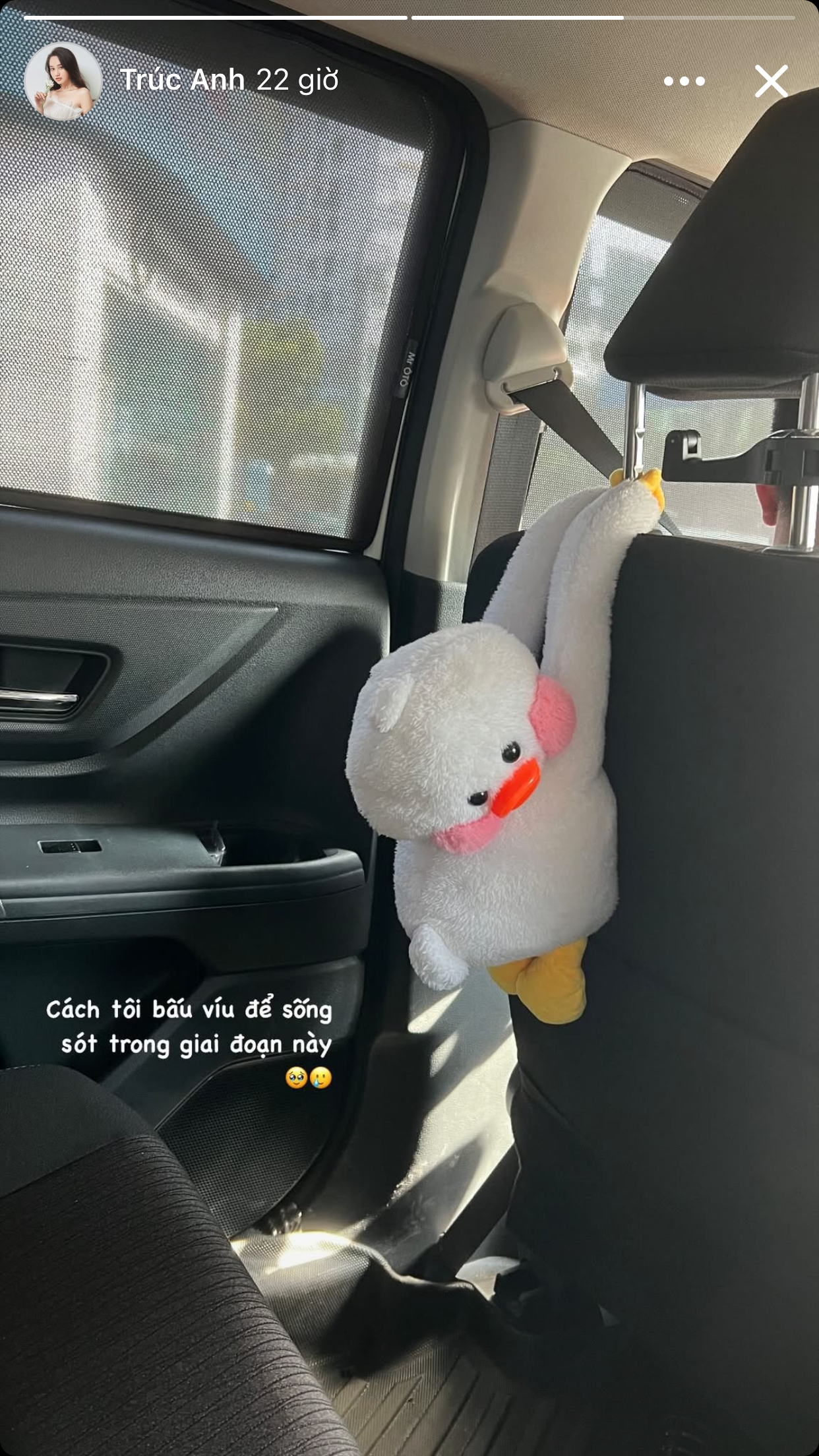 Mới đây, diễn viên Trúc Anh đã đăng tải một hình ảnh mới trên story cá nhân. Trong bức ảnh, một chú gấu bông được treo lủng lẳng trên ghế xe hơi, đi kèm dòng chú thích đầy tâm trạng: "Cách tôi bấu víu để sống sót trong giai đoạn này" cùng với icon buồn bã. Chia sẻ này ngay lập tức thu hút sự chú ý của khán giả và khiến nhiều người hâm mộ không khỏi lo lắng.