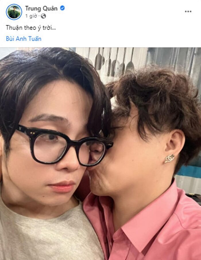 Theo đó, đối tượng thân mật của trung Quân idol không phải ai xa lạ mà chính là bạn thân của anh chàng - nam ca sĩ Bùi Anh Tuấn, cũng là người hát ca khúc Thuận theo ý trời mà Trung Quân idol viết trong dòng trạng thái trên.