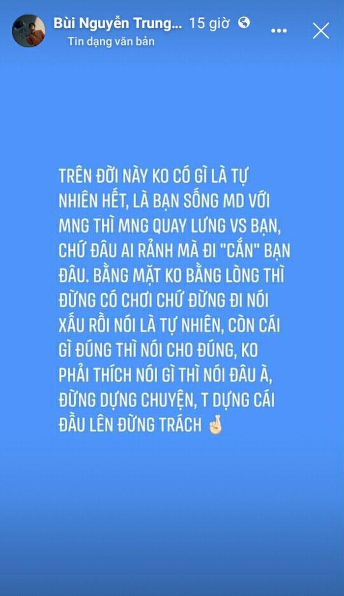 Nam ca sĩ chia sẻ thêm, người bạn này là một người chuyên sống "lá mặt lá trái", tức ở trước mặt người ta thì niềm nở, thân thiết nhưng quay lưng đi thì ngay lập tức nói xấu sau lưng người đó. Không chỉ thế, người này còn là loại người chuyên đi dựng chuyện, nói có thành không, nói không thành có. Và quan trọng, người chơi không đẹp này còn dựng chuyện, lan tin đồn xấu về Trung Quân idol.