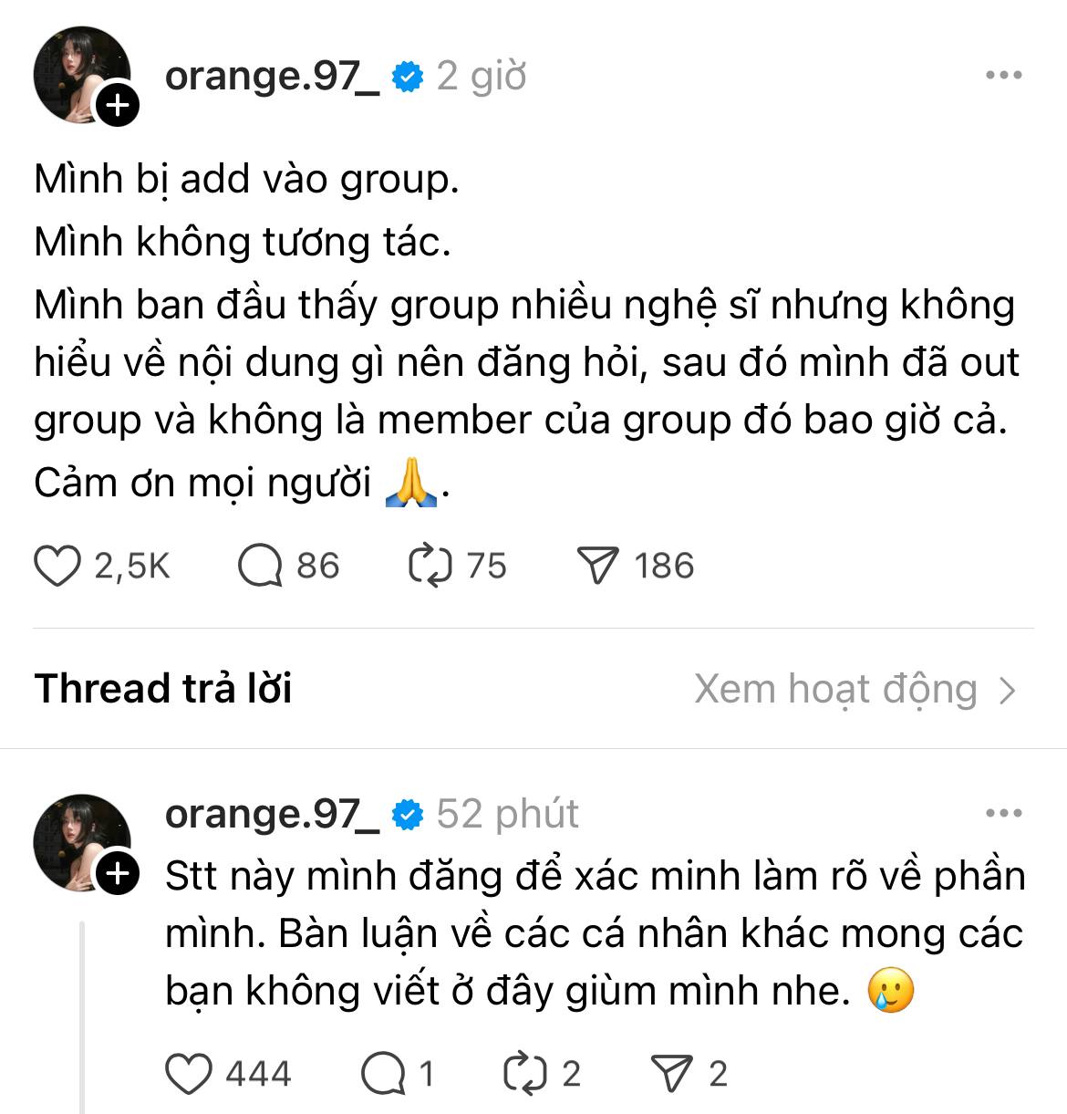 Trước đó, ca sĩ Orange - một trong những nghệ sĩ được "điểm danh" trong nhóm chat nói trên cũng lên tiếng đính chính. Cô chia sẻ: "Ban đầu, tôi thấy nhóm có nhiều nghệ sĩ nhưng không hiểu về nội dung gì nên đăng bài viết để hỏi. Sau đó, tôi đã rời khỏi nhóm và không làm thành viên của nhóm đó bao giờ cả. Cảm ơn mọi người".