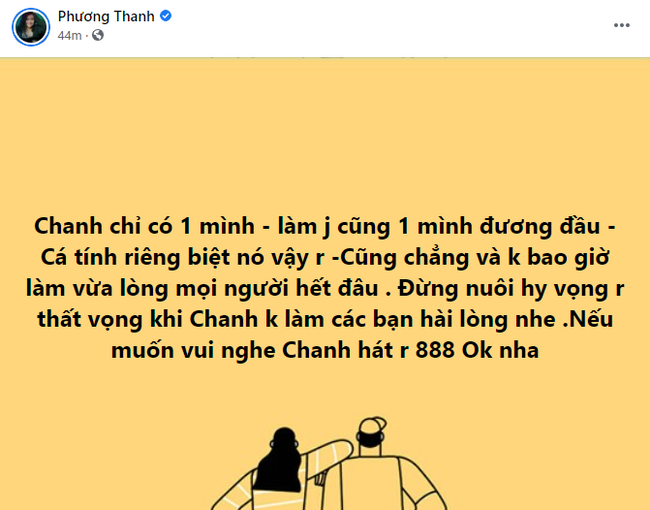 Tiếp đó, Phương Thanh lại chia sẻ thêm: "Chanh chỉ có 1 mình - làm gì cũng 1 mình đương đầu - cá tính riêng biệt nó vậy rồi - cũng chẳng và không bao giờ làm vừa lòng mọi người hết đâu. Đừng nuôi hy vọng rồi thất vọng khi Chanh không làm các bạn hài lòng nhé. Nếu muốn vui nghe Chanh hát rồi 888 Ok nha". Hóa ra, nội dung "thanh lọc" mà Phương Thanh nói trước đó cuối cùng chỉ là nghe hát và chém gió.