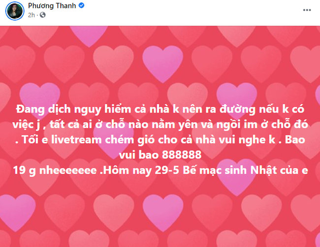 Cụ thể, trong chia sẻ đầu tiên, Phương Thanh viết: "Đang dịch nguy hiểm cả nhà không nên ra đường nếu không có việc gì, tất cả ai ở chỗ nào nằm yên và ngồi im ở chỗ đó. Tối em livestream chém gió cho cả nhà vui nghe không. Bao vui bao 888888. 19 giờ nheeeeeee".