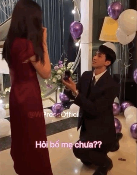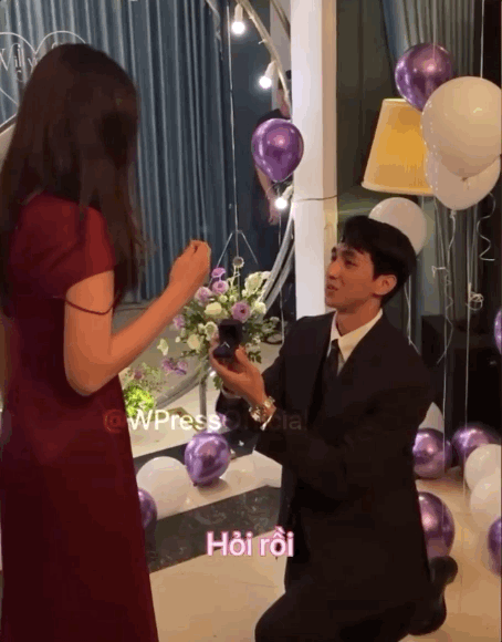 Giữa lúc màn cầu hôn lãng mạn đang gây bão, dân mạng rần rần truyền tay nhau đoạn clip Bình An nói lời yêu thương với Phương Nga. Trong không gian ngập tràn hoa và bóng bay, nam diễn viên đưa nhẫn kim cương tới trước mặt người thương và nghiêm túc nói: "Làm vợ của anh nhé".