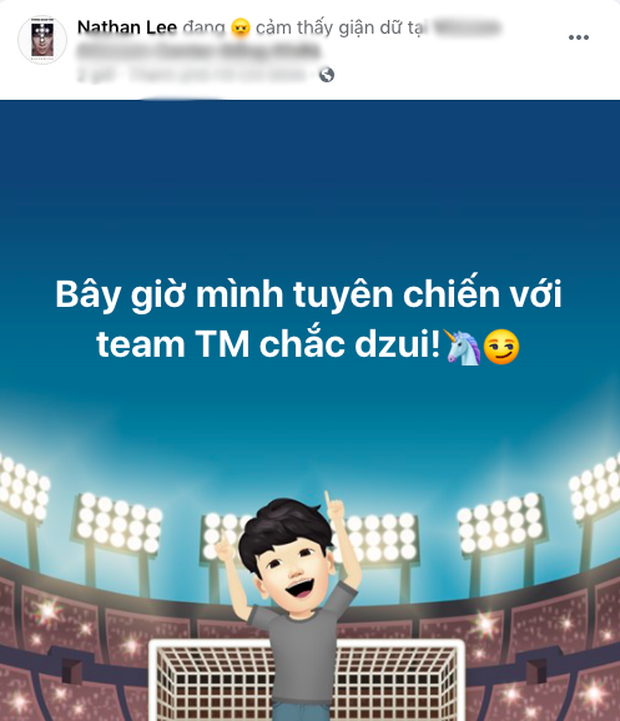 Tiếp tục chuỗi drama không hồi kết, mới đây, Nathan Lee đã có chia sẻ gây chú ý trên trang cá nhân. Theo đó, nam ca sĩ thả nhẹ một dòng trạng thái: "Bây giờ mình tuyên chiến với team T.M chắc vui". Bên dưới phần bình luận, anh tỏ ra ấm ức: "Nhịn bao năm qua là đủ rồi", "Team bên đó cũng do mình tạo ra mà! Đạp một phát bẹp dí hết cả lũ".