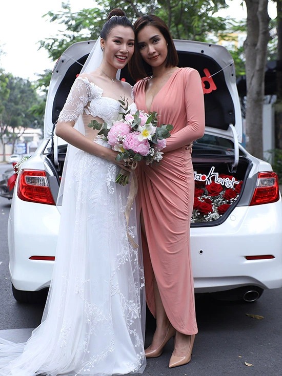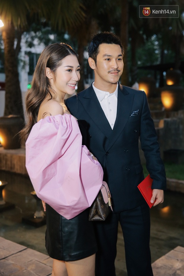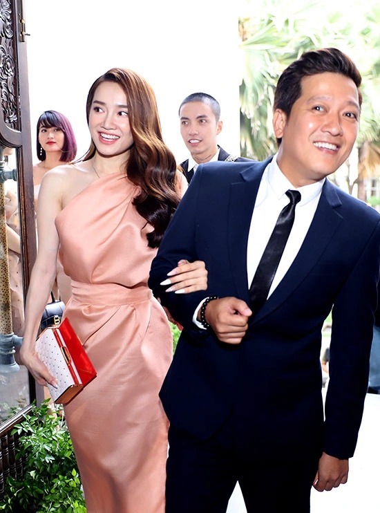 Chiều 1/12, vợ chồng diễn viên Trường Giang - Nhã Phương tình tứ sánh đôi tới chúc mừng hạnh phúc của Á hậu Hoàng Oanh.