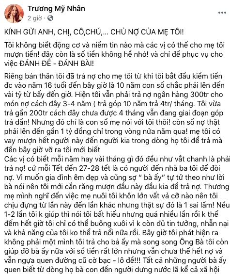 Chiều 03/07, á hậu Trương Mỹ Nhân lần đầu công khai câu chuyện phải trả nợ cho mẹ ruột trong suốt 10 năm qua. Cụ thể, cô viết: "Kính gửi anh, chị, cô, chú... chủ nợ của mẹ tôi.