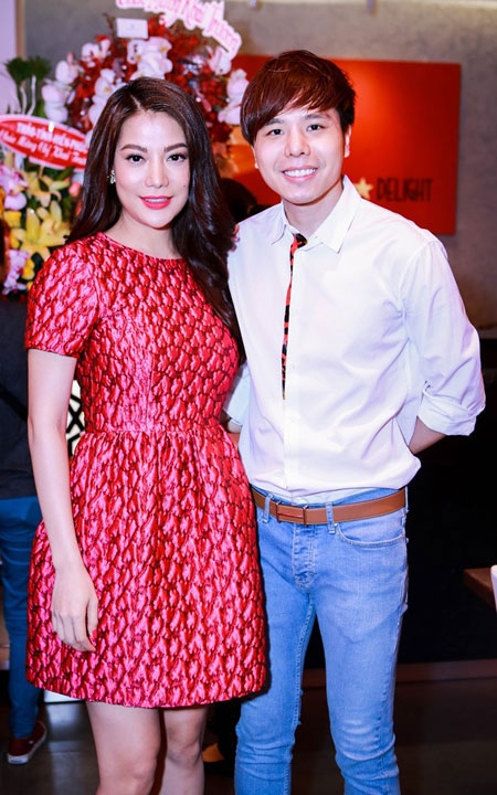 | Ca sĩ Trịnh Thăng Bình mặc trẻ trung đến khai trương quán ẩm thực của đàn chị. |