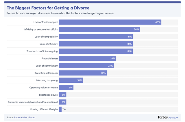 Giá trị gia đình vốn được xây dựng và bồi đắp không chỉ dựa trên tình yêu giữa 2 người mà còn rất nhiều yếu tố khác như kinh tế, văn hóa, xã hội, tâm lý và quan điểm... Và nguyên do khiến nhiều cặp đôi chia tay cũng phát sinh từ những yếu tố này. Theo thống kê tổng quát từ Forbes vào năm 2023, có đến 689.308 cặp đôi ly dị trên toàn thế giới vào năm 2021 và đây là tiền đề để dự đoán xu hướng trong 3 năm tiếp theo. Trong đó, 43% các cặp vợ chồng ly hôn vì thiếu sự hỗ trợ từ gia đình 2 bên, 34% rơi vào trường hợp ngoại tình. Ngoài ra, 4 nguồn cơn bao gồm "sự hòa hợp", "mâu thuẫn tồn tại", "tinh thần trách nhiệm" và "quan điểm nuôi dạy con cái" được chia đều ở khoảng giữa, chiếm tỷ lệ khá cao từ 20-31%.