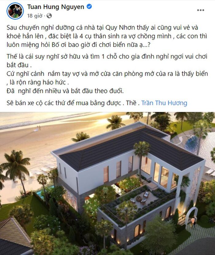 Suy đoán lí do nam ca sĩ bán đi chiếc xe, dân tình cho rằng anh đang trong quá trình hiện thực hóa ước mơ của vợ về một căn biệt thự view biển. Có lẽ Tuấn Hưng đang trong quá trình hoàn tất thủ tục để tậu căn nhà về tay.
