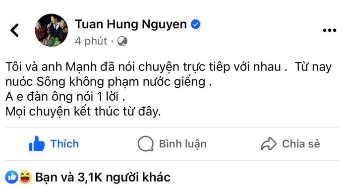 Đêm muộn 29/11, Tuấn Hưng chia sẻ dòng trạng thái làm rõ mối quan hệ với Duy Mạnh. Theo đó, nam ca sĩ viết: "Tôi và anh Mạnh đã nói chuyện trực tiếp với nhau. Từ nay, nước sông không phạm nước giếng. Anh em đàn ông nói 1 lời, mọi chuyện kết thúc từ đây".
