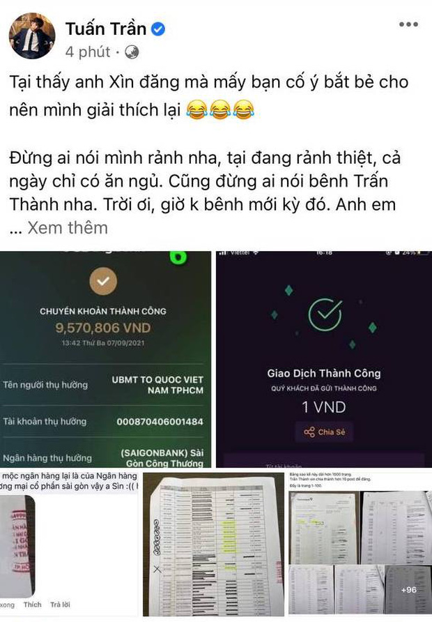 08/09/2021 05:24Tuấn Trần giải thích loạt thắc mắc về sao kê của Trấn Thành: Từ chuyển khoản 200 đồng, dấu mộc giả và 2 chi tiết đặc biệt