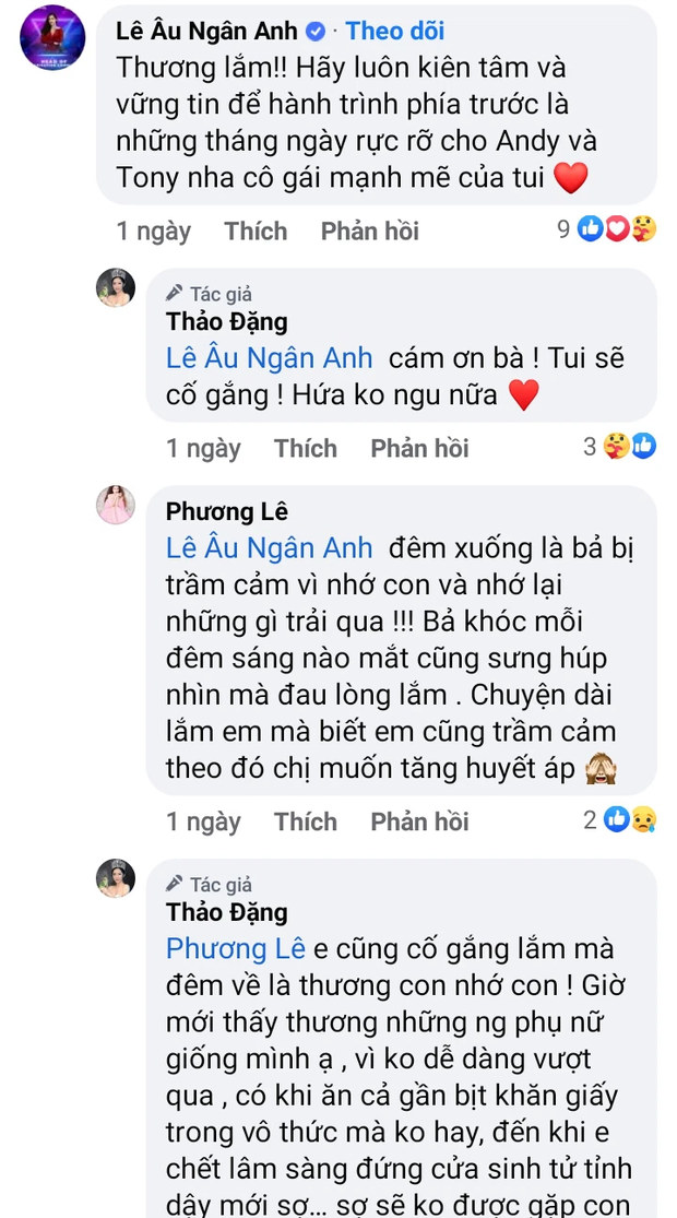 Tưởng chừng sau ồn ào trên, mối quan hệ giữa Hoa hậu Đặng Thu Thảo và Hoa hậu Ngân Anh sẽ rất căng thẳng. Tuy nhiên, động thái mới đây của cả hai lại chứng minh điều hoàn toàn ngược lại. Theo đó, Ngân Anh đã để lại bình luận khi đọc được dòng trạng thái chia sẻ chuyện bị trầm cảm trước và sau khi sinh cũng như chuyện ly hôn và bị chồng bạo hành của Đặng Thu Thảo: "Thương lắm! Hãy luôn kiên tâm và vững tin để hành trình phía trước là những tháng ngày rực rỡ cho Andy và Tony nha cô gái mạnh mẽ của tui". Đáp lại Ngân Anh, Đặng Thu Thảo bày tỏ: "Cảm ơn bà! Tui sẽ cố gắng. Hứa không ngu nữa".