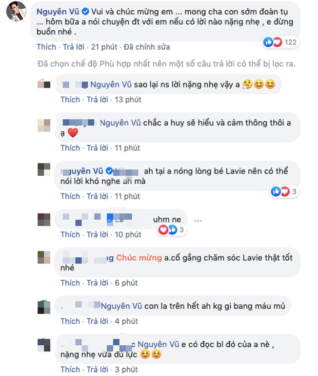 Chính vì thế, khi chứng kiến Phùng Ngọc Huy đã thực sự giành được quyền nuôi dưỡng con gái, Nguyên Vũ đã lên tiếng nhận sai và thừa nhận mình quá nóng vội khi "mắng oan" đàn em. "Vui và chúc mừng em, mong cha con sớm đoàn tụ. Hôm bữa anh nói chuyện điện thoại với em nếu có lời nào nặng nhẹ, em đừng buồn nhé. Tại anh nóng lòng bé Lavie nên có thể nói lời khó nghe", Nguyên Vũ bày tỏ.