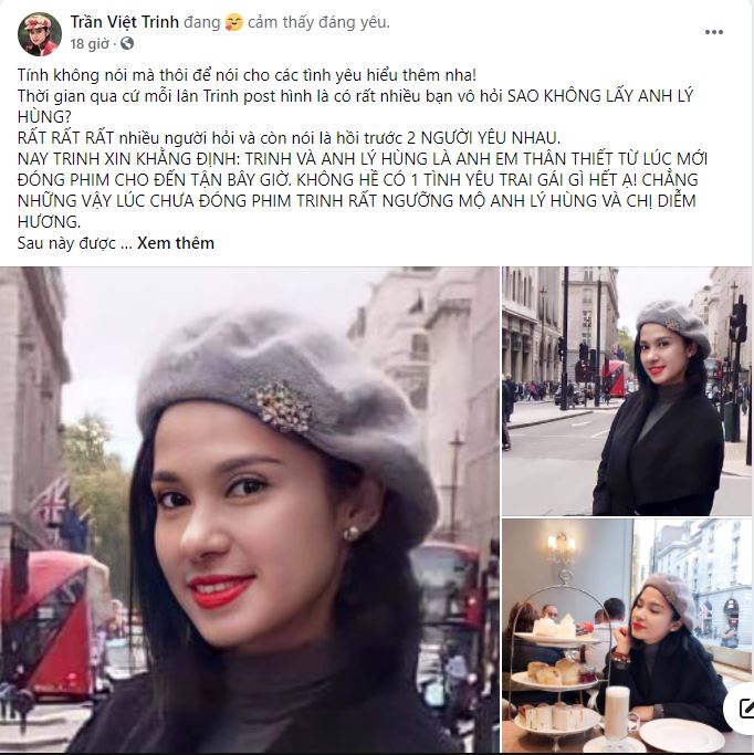 "Tính không nói mà thôi để nói cho các tình yêu hiểu thêm nha! Thời gian qua cứ mỗi lần Trinh post hình là có rất nhiều bạn vô hỏi sao không lấy Lý Hùng? Rất rất rất nhiều người hỏi và còn nói là hồi trước 2 người yêu nhau. Nay Trinh xin khẳng định: Trinh và anh Lý Hùng là anh em thân thiết từ lúc mới đóng phim cho đến tận bây giờ. Không hề có 1 tình yêu trai gái gì hết ạ. Chẳng những vậy, lúc chưa đóng phim, Trinh rất ngưỡng mộ anh Lý Hùng và chị Diễm Hương. Sau này được đóng chung với 2 anh chị, Trinh thấy mình rất may mắn và hạnh phúc. Trinh xin nói lại 1 lần cho rõ ạ", Việt Trinh viết trên trang cá nhân.