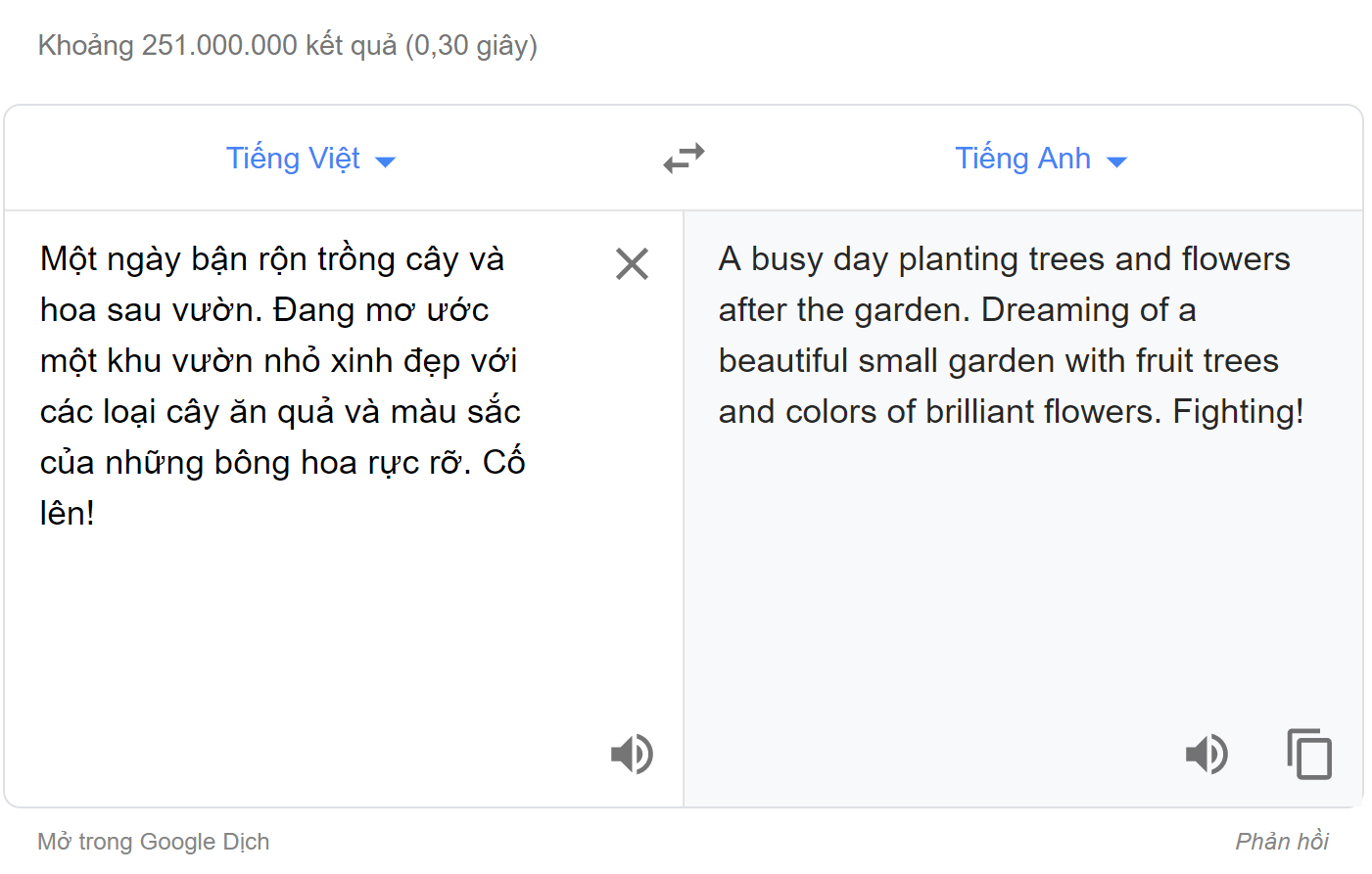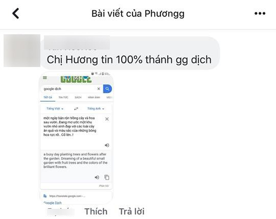 Ngay bên dưới là đoạn "vietsub" được dịch bởi chính Phạm Hương: "Một ngày bận rộn trồng cây và hoa sau vườn. Đang mơ ước một khu vườn nhỏ xinh đẹp với các loại cây ăn quả và màu sắc của những bông hoa rực rỡ. Cố lên!".