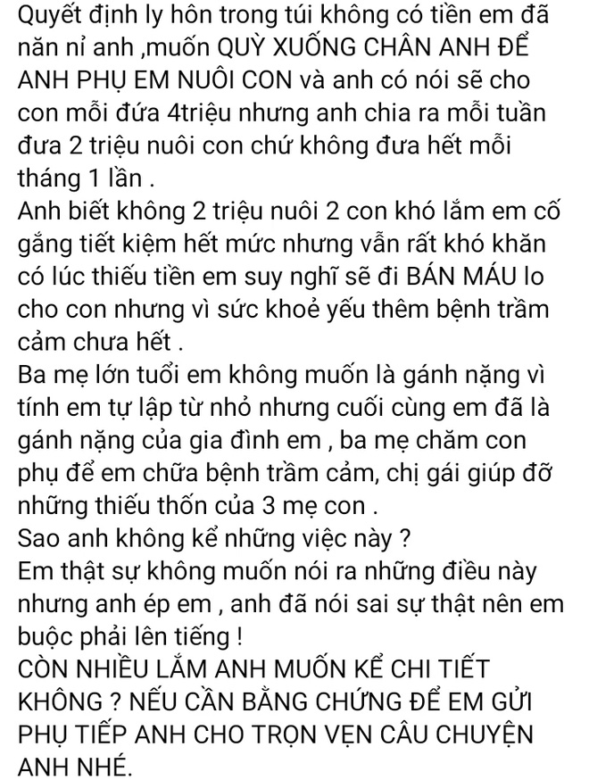 Quyết định ly hôn trong túi không có tiền em đã năn nỉ anh, muốn quỳ xuống chân anh để anh phụ em nuôi con và anh có nói sẽ cho con mỗi đứa 4 triệu nhưng anh chia ra mỗi tuần đưa 2 triệu nuôi con chứ không đưa hết mỗi tháng một lần. Anh biết không 2 triệu nuôi 2 con khó lắm, em cố gắng tiết kiệm hết mức nhưng vẫn rất khó khăn có lúc thiếu tiền em suy nghĩ sẽ đi bán máu lo cho con nhưng vì sức khoẻ yếu thêm bệnh trầm cảm chưa hết.