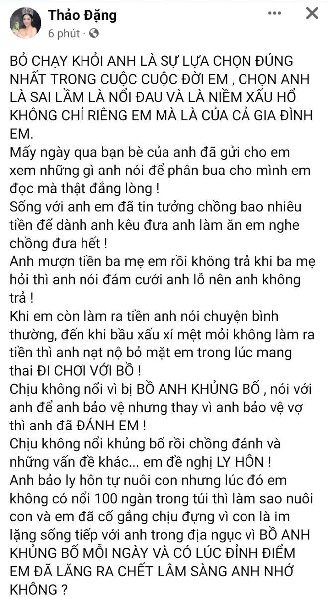 Đặng Thu Thảo kể câu chuyện bị bạn bè của chồng cũ liên tục gửi link báo viết về việc nam doanh nhân này phân bua chuyện chia tay với vợ cũ làm cô đắng lòng: "Sống với anh, em đã tin tưởng chồng bao nhiêu tiền để dành anh kêu đưa anh làm ăn, em nghe chồng đưa hết. Anh mượn tiền ba mẹ em rồi không trả khi ba mẹ hỏi thì anh nói đám cưới anh lỗ nên anh không trả. Khi em còn làm ra tiền anh nói chuyện bình thường, đến khi bầu xấu xí mệt mỏi không làm ra tiền thì anh nạt nộ bỏ mặc em trong lúc mang thai đi chơi với bồ. Chịu không nổi vì bị bồ anh khủng bố, nói với anh để anh bảo vệ nhưng thay vì anh bảo vệ vợ thì anh đã đánh em. Chịu không nổi khủng bố rồi chồng đánh và những vấn đề khác... em đề nghị ly hôn".
