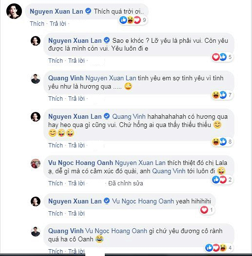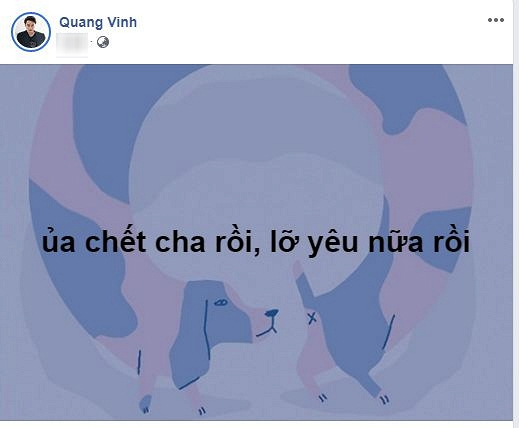 Mới đây, "hoàng tử sơn ca" bất ngờ tiết lộ trên trang cá nhân: "Ủa chết cha rồi, lỡ yêu nữa rồi" và thu hút sự chú ý của đông đảo cư dân mạng. Siêu mẫu Xuân Lan bày tỏ sự thích thú: "Thích quá trời ơi. Sao em khóc? Lỡ yêu là phải vui. Còn yêu được là mình còn vui. Yêu luôn đi em". Vẫn với thái độ dè chừng thường thấy, Quang Vinh chia sẻ: "Em sợ tình yêu vì tình yêu như là hương qua...".